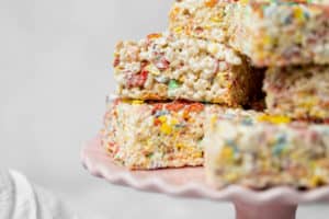 In a large bowl, pour the Rice Krispies and Fruity Pebbles in the bowl, then the cup of fluff. Pour over the marshmallow and butter mixture. Mix until fully combined then pour into the pan. Top with extra Fruity Pebbles for good measure.