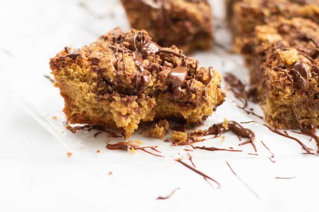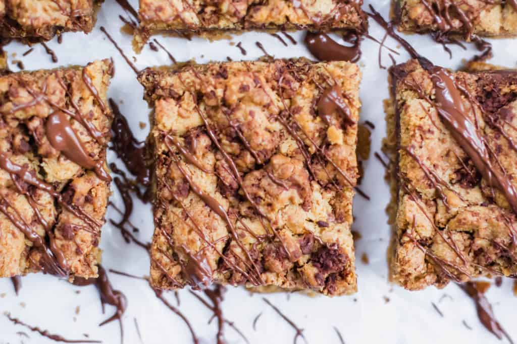 I start off with mixing the softened butter and peanut butter together. Add in the brown sugar, eggs and vanilla. Then mix in your dry ingredients. Spread into a prepared 9×13 baking dish, bake for 30 minutes. For the chocolate drizzle, place semi sweet chocolate chips in a microwavable bowl and microwave in intervals of 30 seconds so the chocolate doesn’t burn.
