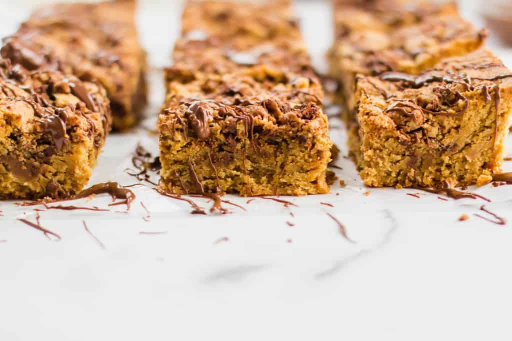 - 1. Preheat oven to 350 degrees. 2. In a mixing bowl, mix together the softened butter and peanut butter together. Stir in brown sugar, vanilla and eggs. 3. Add flour and baking powder. Spread batter into a prepared 9×13 baking dish. Bake for 30 minutes or until a toothpick comes out clean. 4. Let cool for 30 minutes before drizzling chocolate over peanut butter blondies. 5. To melt chocolate, place in a microwavable safe bowl and microwave in 30 seconds intervals until the chocolate is melted.