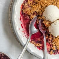 Add the berries into a 9 in Pie pan and add the crisp topping. Bake for 35-40 minutes. Let it cool for about 10 minutes, serve with vanilla ice cream or whipped cream.